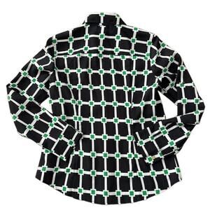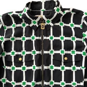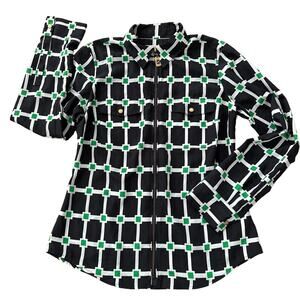 Michael Kors, black, green and white blouse with zipper closing on the front two chest pockets, roll up sleeves with button to make shorter.