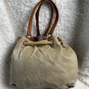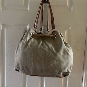 Michael Kors canvas faded gold shoulder bag Gold Threads Drawstring Rope with Tassels and Leather straps . Top snap closure the inside lining has a side zipper four side pockets pre owned in fair used used condition the gold color is faded signs of wear on the bottom front and corners of the bag the lining has ink stains see all pictures any questions please message.E10