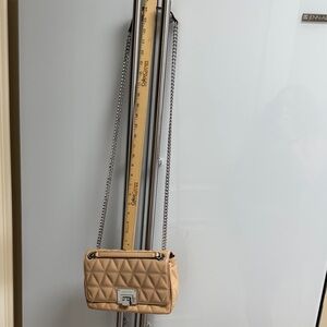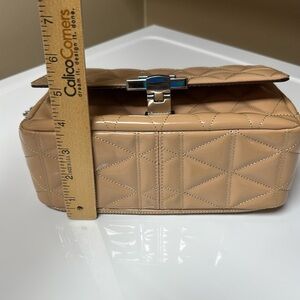 Elegant quilted patent leather shoulder bag in a stylish tan color. Can be dressed up or down, looks amazing with any outfit