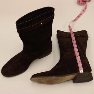 Michael Kors Rhea Suede Boots With Fringe. Dark brown, suede, almond toe, harness strap, leather sole and fringe around gold MK hardware.