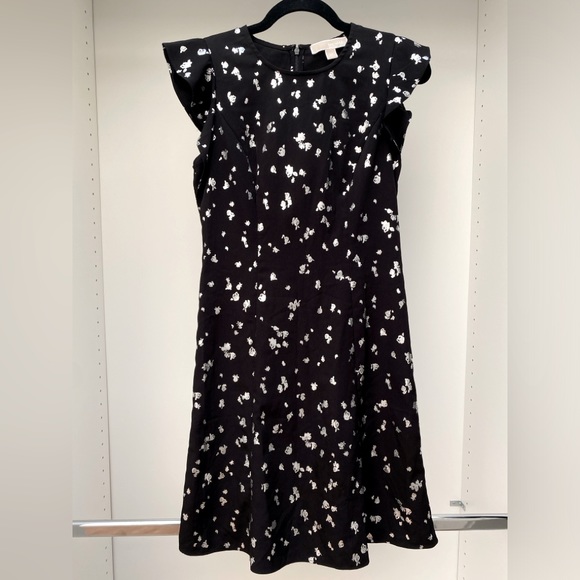 Black-metallic Michael Kors dress. Size XS. Shoulder-hem length 36”. Used once. Flutter sleeves and very light material.