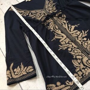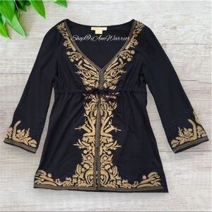 Michael Kors light weigh navy blue tunic top with gorgeous champagne/tan embroidered design. Has flattering higher empire babydoll waist that can be tied as tight as you like. EUC, smoke free home. Looks amazing with dark wash denim or a tan pencil skirt. See photos for measurements.