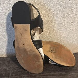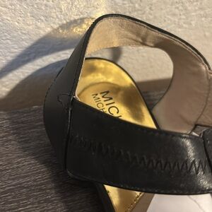 A black leather Michael Kors sandal with a gold zipper detail on the front strap.