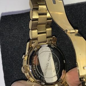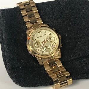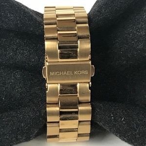 pre-owned but kept in felt pouch. fits 5 1/2 wrist. The Michael Kors Gold Dial Gold Tone Link Band Watch is the classic timepiece you have been waiting for. This exceptional watch begins with a round 38mm gold-toned stainless steel case with a fixed gold-toned bezel and a textured gold-toned crown with two pushers. These elements surround a golden dial, which is protected by a hardened mineral crystal and features gold-toned index and Arabic numeral hour markers and luminous gold-toned hand