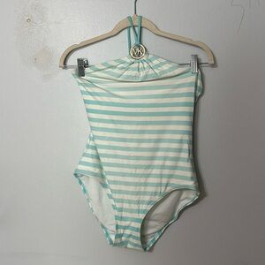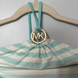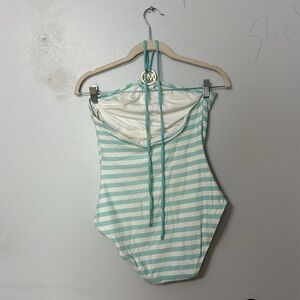 Michael Kors green & white striped halter top w/ gold emblem swimsuit size 8