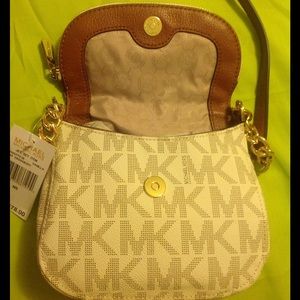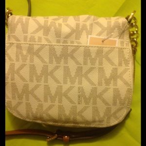 Ladies this is big on style. This powerhouse from MICHAEL Michael Kors gives you a luxe look while your on the go. Logo-splashed MK signature Adjustable crossbody strap with 22"-24" drop 8" W x 6-1/2" H x 2" you'll wear it well!👛