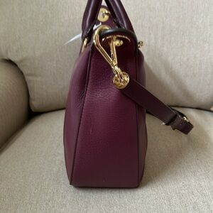 A very nice Micheal Kors leather shoulder bag. It has gold hardware with a shoulder strap and tote bag handles. This bag has pockets on side for phones and other items. It’s 14 incheses wide, 9 inches high and 4 inches wide at widest part. A beautifully plum color!