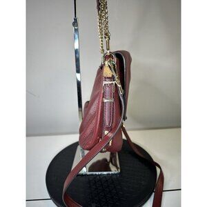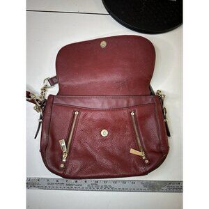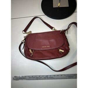 The Michael Kors handbag is a stylish shoulder bag made of black leather with gold detailing. The exterior color is burgundy, complemented by a gold lining color and black hardware color. This handbag exudes luxury and elegance, perfect for women looking to make a statement with their accessory. With its high-quality leather material and iconic Michael Kors branding, this handbag is a must-have for fashion-forward individuals.