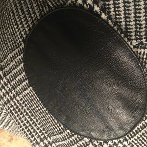 Classy Michael Kors black and off-white houndstooth blazer with leather collar and elbow pads. One button at the waist and two pockets. The collar and elbow pads are "professional leather) and the lining is acetate. Actual blazer shell is polyester, woold, and spandex. Has a great shape and would look good dressed up or down.