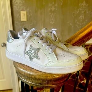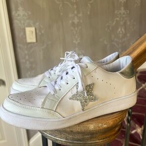 Michael Kors, ladies white and silver star sneaker excellent condition, lace up good looking sneaker great walking shoe. Nice white sneakers for the summer again excellent condition.