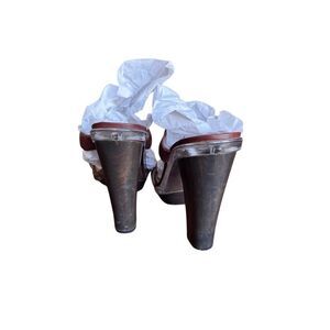 Brown double strap heeled sandals. Front has Michael Kors metal plate. In very good condition, a few scuffs on heel. 5” heel 1” front platform.