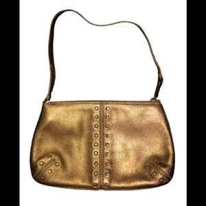 This is a Michael Kors wristlet in excellent condition. It is genuine metallic gold leather, with gold studs along the seams.