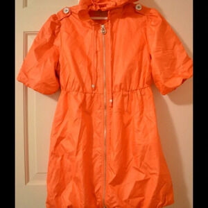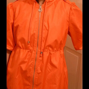 Like new Orange Michael Kors light coat. In perfect shape and condition!. Size small. Has zipper that has MK engraved (2). Buttons each shoulder has Michael Kors engraved. Shoulder to shoulder 14 1/2". Neck to end 28". Shoulder to elbow 11". Beautiful light coat! Has tie around ribbon which can be use around back or front.