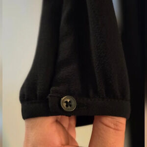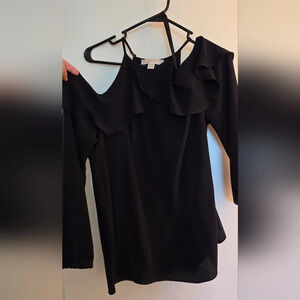 This gently used, lightweight off-the-shoulder top features tiered ruffles for a playful touch. It has 3/4 sleeves and is in excellent condition.