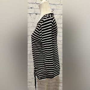 Elevate your wardrobe with this chic Michael Kors blouse. The black and white striped design adds a touch of sophistication to any outfit. This long sleeve blouse is made of a comfortable cotton blend material, perfect for all-day wear. The pullover closure and regular size type make it easy to wear and size large. Ideal for any woman looking to add a stylish piece to their collection. Smoke free home. 20 inches pit to pit and 23 inches long.