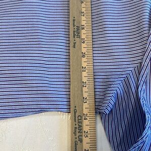 This shirt is in excellent condition. Such a nice shirt blue and purple. No tears or holes. Smoke free home