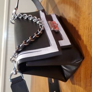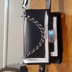 Black and white smooth leather Cece bag by Michael Kors. Bag is just shy of new condition, even still has some of the original packaging inside. The smooth black finish has some marks that only show in reflected light. The white "paint" stipe has some spots that are a little wrinkled. Interior is black suede. Silver hardware. Long strap is removable.