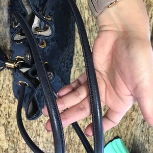 Navy blue medium size Michael Kors handbag only. Approximate size of handbag is 15 width x 16 including handles. Almost new...please see photographs. Last pic shows stitching on handle that is sticking out a bit...but purchased that way. Wallet is not for sale...ONLY HANDBAG.