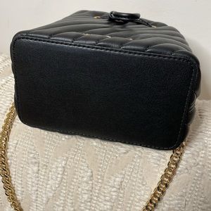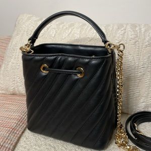 Cute Michael Kors mini bucket bag with 2 detachable straps and gold hardware. Smooth leather in a chevron pattern makes this little cutie stand out!