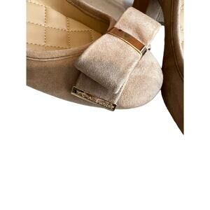 New Michael Kors modest nude suede low heels with bow detail, size 6. Diamond quilted insole, non slip soles, stacked heel and bow detail with gold logo hardware. Perfect for anything from work to lunch. Classic sophisticated style!