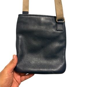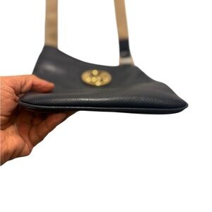 Elegant navy blue cross-body bag with a tan strap. Features MK logo accent.soft leather, no damage, in excellent condition, spotless inside and out