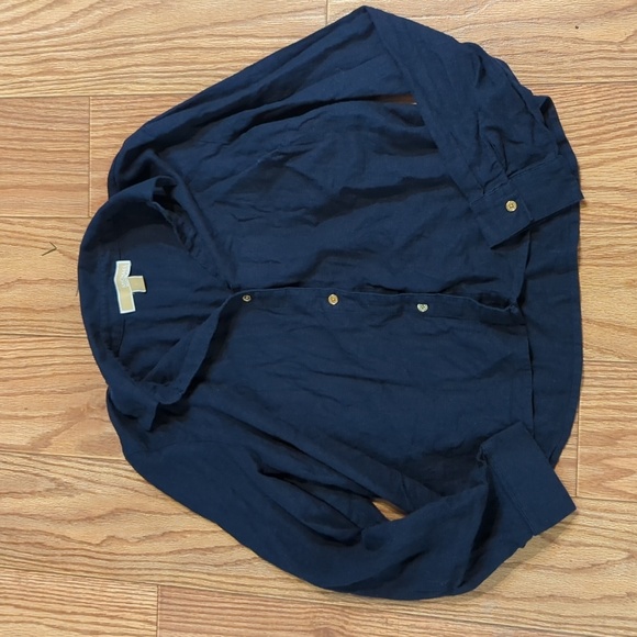 Michael Kors navy blue button up blouse gold buttons linen viscose size large