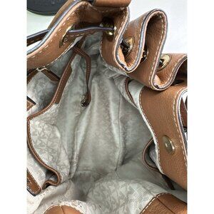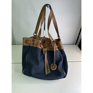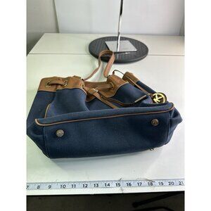 The Michael Kors navy large canvas leather tote is a stylish and spacious handbag designed for women. Made with a durable canvas exterior in a solid blue color, this tote features a snap closure and a leather handle/strap for easy carrying. The spacious interior is lined with canvas in a beige color, with a bag charm for added flair. Perfect for everyday use, this tote from the Michael Kors product line combines fashion and functionality for a chic accessory for any outfit.