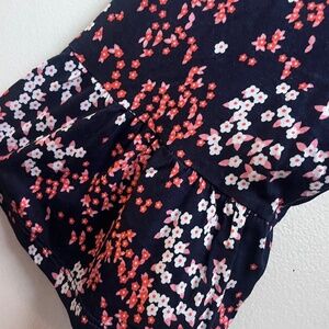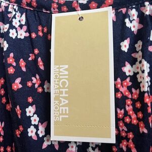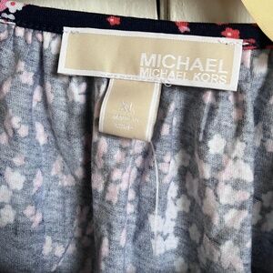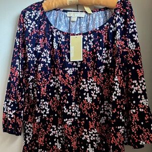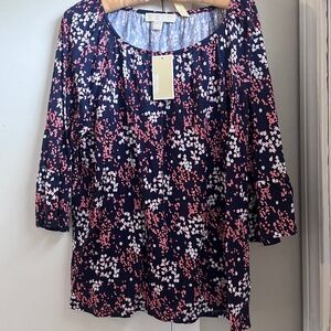 Michael Kors Blouse in navy blue delicate pink white and coral flowers. Loose fit. Uneven stylish hem. 3/4 Sleeves. Size XL
