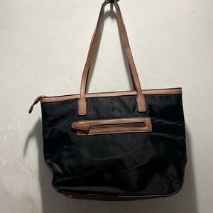 Michael Kors, nylon tote bag, color, black and brown gold tone hardware and it’s also leather leather straps two pockets on the front two zipper pockets on the front one zipper pocket in the back one zipper pocket with Michael Kors gold hardware on it under that another slide side pocketThere are two compartments for your phone very nice, clean excellent condition, preload and excellent condition.