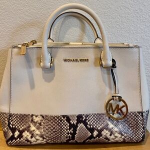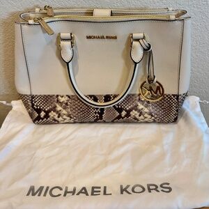 Michael Kors cream pebbled leather and snake print handbag. Excellent condition, just minor ink marks on inside lining. Comes with dust cover but shoulder strap missing.