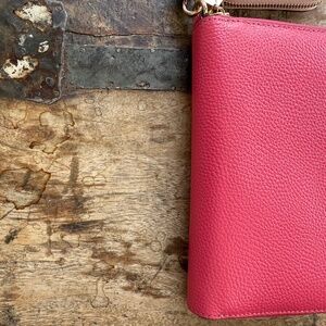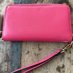 True pink pebbled leather wallet with goldtone embellishments and a zipper close.Removable handle.10 compartments inside,one with a zipper.7/4 in.In excellent like new condition. Fast ship!