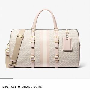This Michael Kors duffel bag showcases a stylish tan and gray color palette with the signature MK monogram print. It features a structured design with brown leather accents and an adjustable shoulder strap for versatile carrying. Ideal for travel or daily use, this bag combines elegance with practicality. Has trolley pass through to put on top of a suitcase or zipper close for an extra pocket. Interior has lots of pockets for organization. Used once.