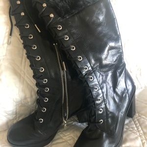Black leather platform, side zip, lace up with faux fur,barely used boots.