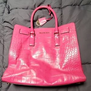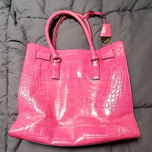 Beautiful hot pink Michael Kors purse. Croc print, inside zip and multiple pockets for storage. Does not have long strap.