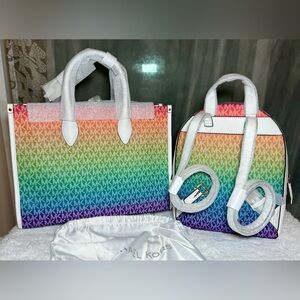 Eye-catching bag set with multicolor rainbow gradient. Features gold hardware and logo accents. MK medium sized Jayce backpack & MK medium sized Mirella tote.