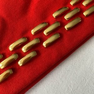 Michael Kors red cocktail dress. US size 6, runs a little large- I typically wear an 8. This is a thick material, long sleeves and the gold embellishments are heavy and not cheap pieces of metal. I wore this once to a Gala. This hit me right around the knee and I am 5’6” for reference