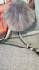 Elegant white mini tote with silver chain hardware details. Features a stylish lavender pom-pom and leather collectible charm. Perfect for everyday use.