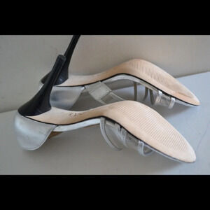 New never worn Michael Kors heeled sandals. Size 7. Leather and synthetic fabric. Gorgeous silver color! Heels 3 1/2". Lightly padded leather insole. Beautiful shoes!