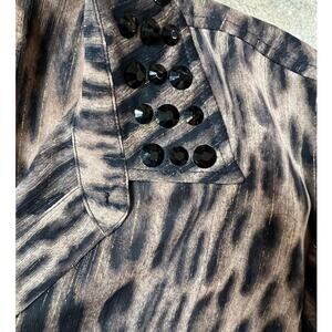 Michael Kors sheer animal print button down, bloluse/shirt. Has black beading studs on collar and 2 front pockets on chest. Sleeves have tab inside to secure rolled up sleeves. Black, brown with gold shimmer streaks through out. Rounded hem, back is couple inches longer than front. Nice like new condition.