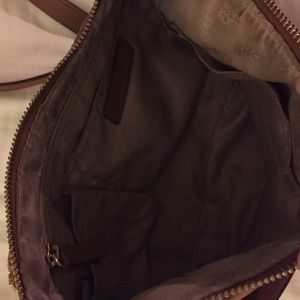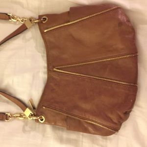 Tan and gold Michael Kors bag. Shows signs of wear but a perfect size bag! Has a large zipper pocket and contains four other pockets in the purse. Does have some rust and stains but not very noticeable
