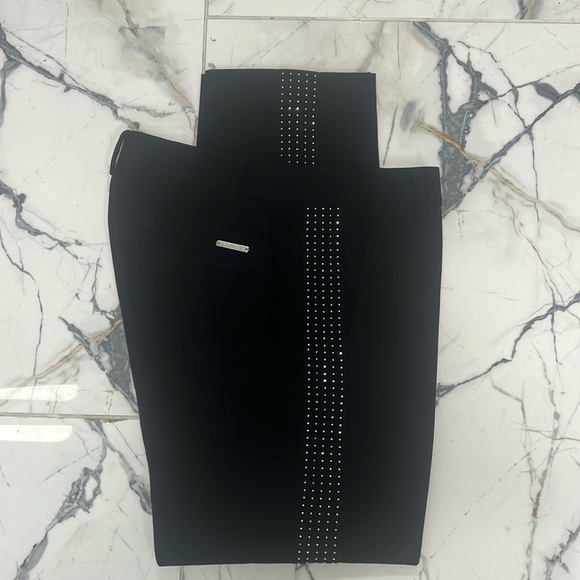 PREOWNED black pants, size 2. Straight legs, made of polyester and viscose.