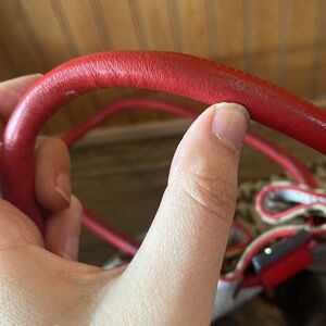 Good condition- inside is perfect! A little wear on the handle ( pictured) looks like color transfer. Not peeling.