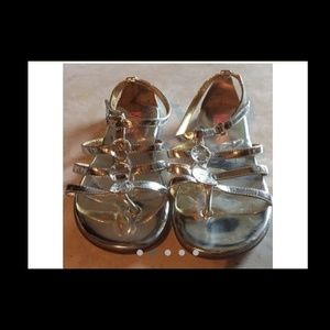 MK silver sandals with jewels and MK imprinted on them going up the foot.