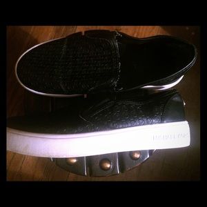 Michael kors slip ons/ slides . Boys (big boys) sz 2.5. Very cute. Kinda have that destressed look w shoe but dark black feaux leather. In good used condition. Can be dressy or casual.