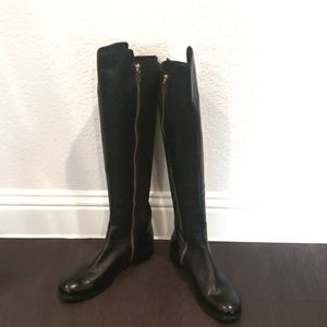 Like new Michael Kors Low 1.25 inch stack heel black stretch knee high boot. 100% Vachetta leather, soft and smooth. Excellent condition. worn once. Round toe. Gold zipper. leg circumference 13.5. for a thin or thicker calf.