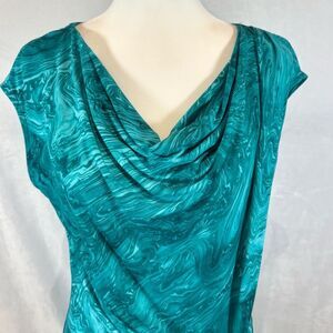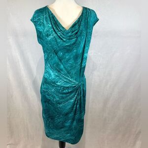 The colors of the dress are simply beautiful. Front ruched twist on one side. Cowl neck. Stretchy material. EUC