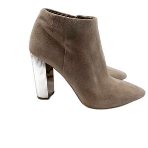 Michael Kors Paloma Booties, pointed toe with a silver heel, grey suede leather, zipper on inside of shoe, size 5,5 gently worn with some scuffs from wearing but in overall good condition