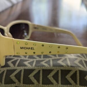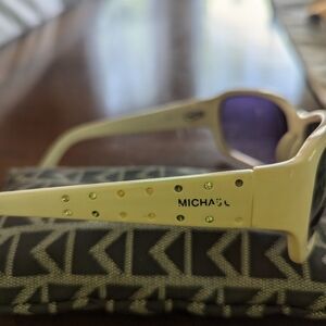 Model M2636S, ivory plastic frame with studs on sides of temples (some missing) and very strong hinges. 5.25 " will fit snugly on a woman's smaller head. Very small glass smudge on lower left lense (see last photo) does not interfere with vision.