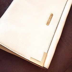 Pre-owned Michael Kors supple leather clutch handbag MK. Can be used with or without strap. Gold hardware & creme or ivory soft leather. Great condition. The hardware was scuffed on the left side so I took a closeup of it in pic 2