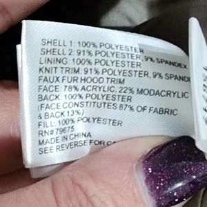 Shell, lining & fill: polyester; fill power: 400; shell 2 & knit trim: polyester/spandex; faux fur: modacrylic/polyester